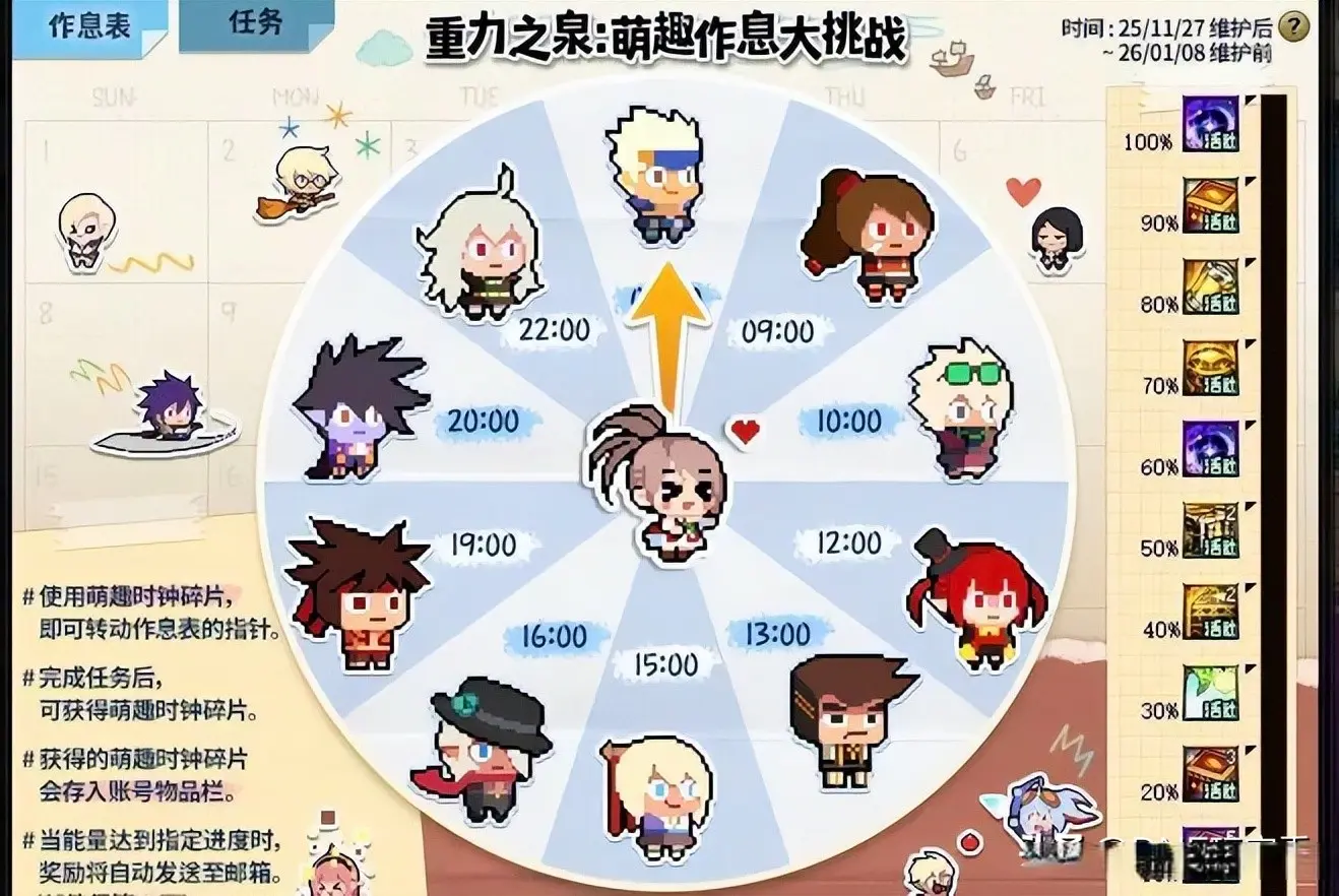 11.27-1.08期间,完成“在线、刷图”任务,获取“碎片”,然后消耗“碎片”拨动时钟,根据进度获得奖励。