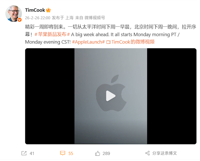 快科技2月26日消息,苹果CEO库克今晚发文称:下周会很热闹,一切从北京时间下周一晚间,拉开序幕。