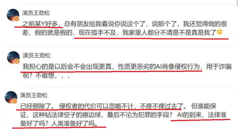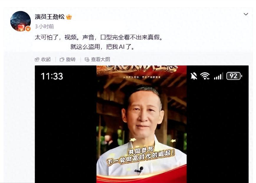 除了表达愤怒之外,王劲松还发文表示,之前在某平台也见过有关他的 AI 造假视频,但都不是很像,能看出真假来,现在的 AI 造假视频已经连家人都无法分辨真假了,他担心以后会不会出现更真、更恶劣的 AI 肖像侵权行为用于诈骗。