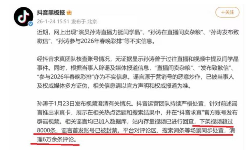 第三个原因是惩罚力度太轻,对 AI 造假行为难以形成威慑,比如在孙涛被造谣事件中,某平台只用一天时间就下架 8000 条视频,清理 6 万多条评论,封禁谣言首发账号,但也仅此而已。